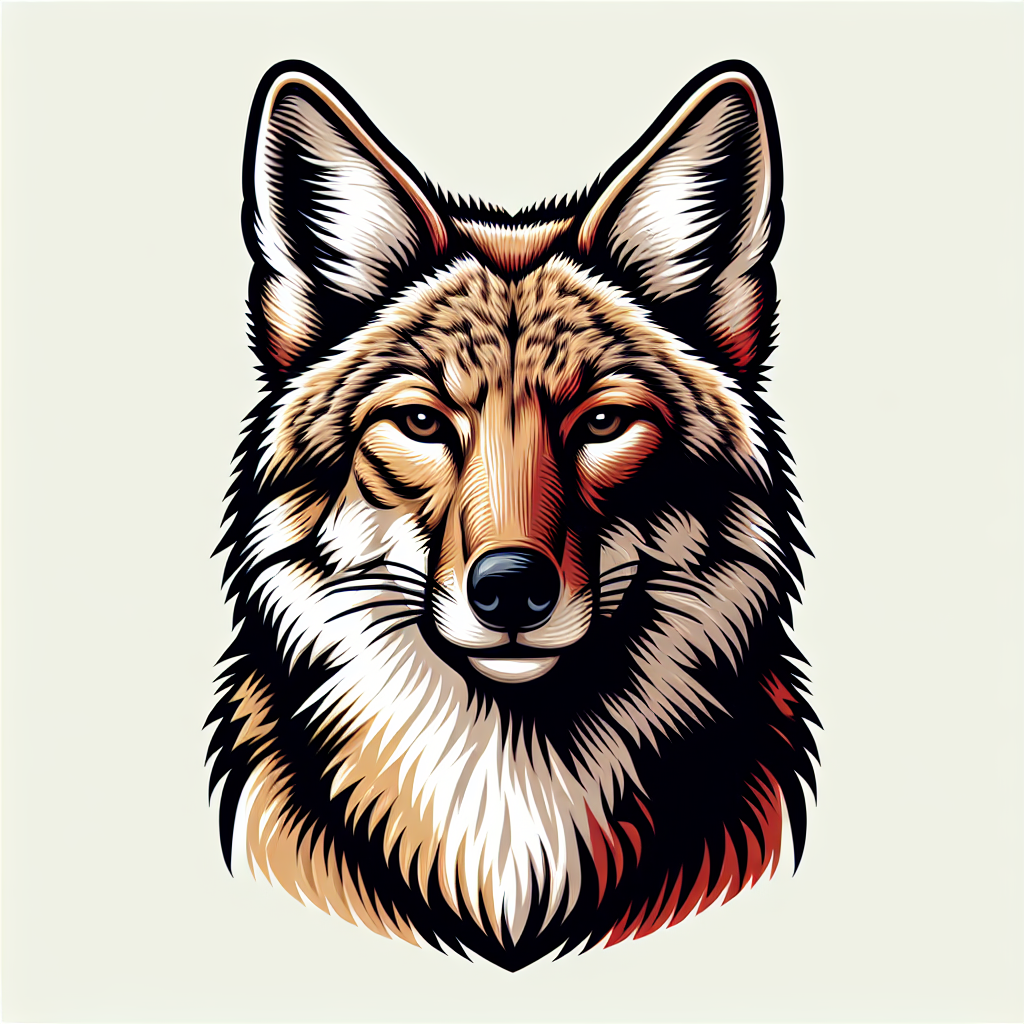 A close-up illustration of a coyote's head with large ears, focused eyes, and a bushy muzzle.