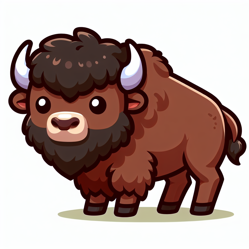 A cartoon buffalo with large, brown eyes, a black beard, and a brown coat stands on a white background. It has short legs and a long, curved tail.