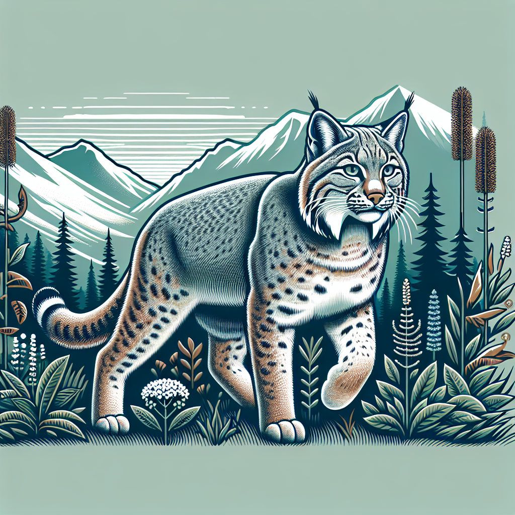 An illustration of a bobcat walking through a forest, with snow-capped mountains in the background