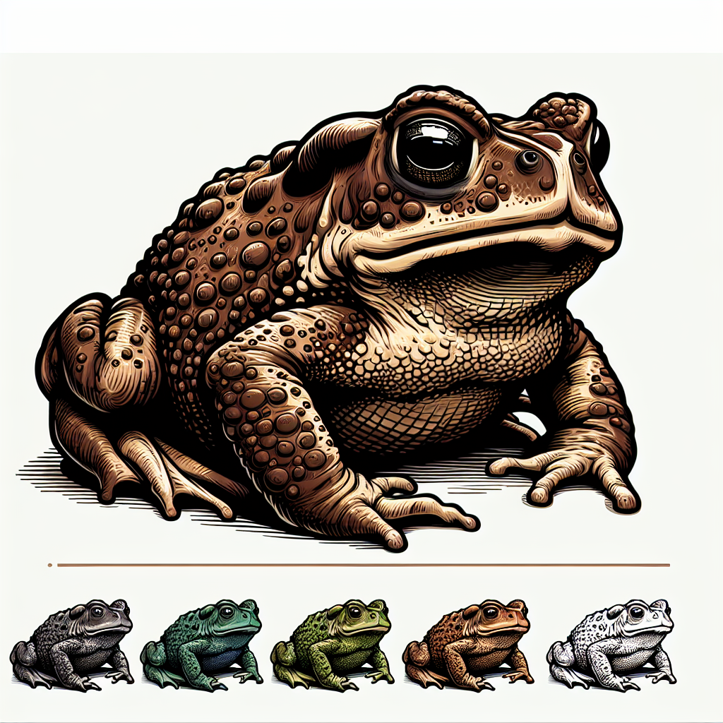 A detailed illustration of a brown toad, with warty skin and large eyes, sits on a white background