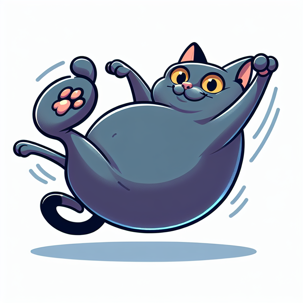 A cartoon illustration of a plump, blue cat with a happy expression flying through the air with its limbs outstretched
