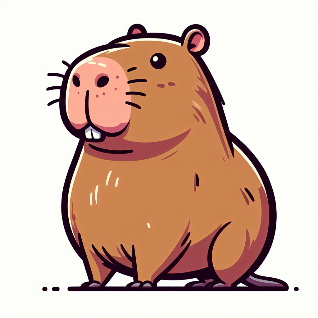 A cartoon capybara with brown fur and pink ears and nose sits on a white background, looking to the right of the viewer