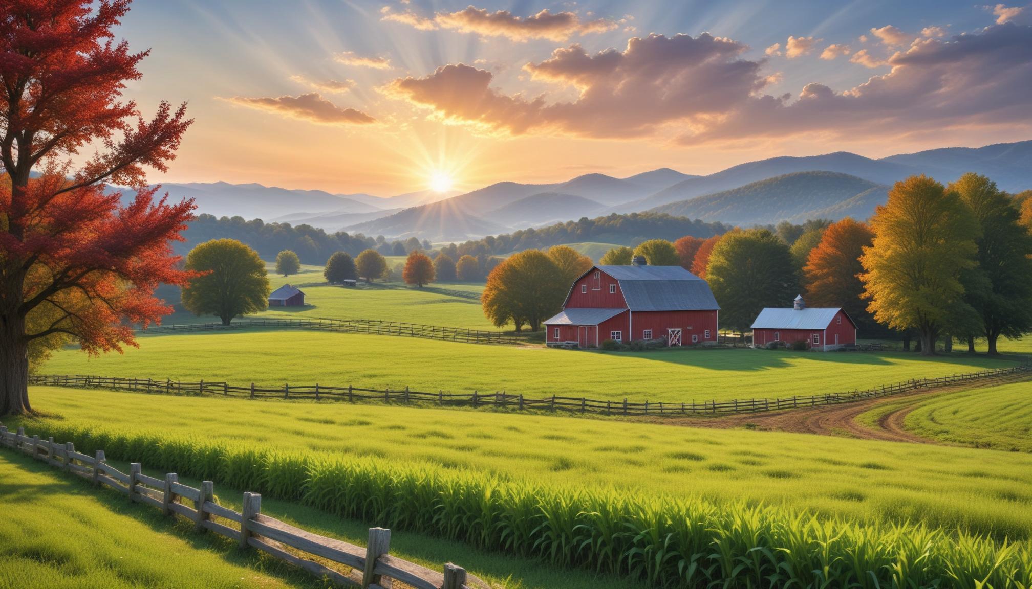 barn, beautiful, clouds, countryside, dawn, farm, fence, grass, green, landscape, morning, mountains, nature, red, rural, sky, sunrise, trees, valley, wooden