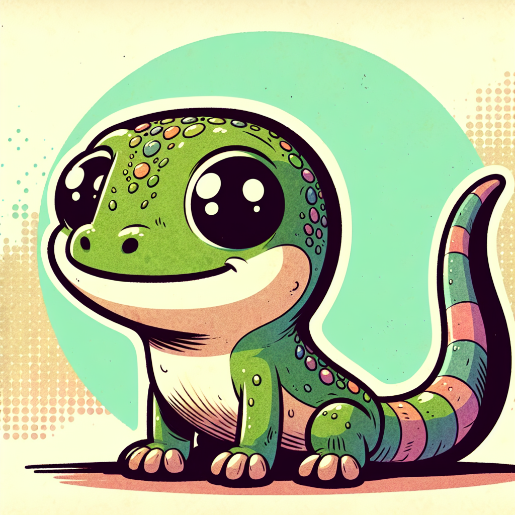 A cartoon gecko with large, black eyes and a bright green body sits on a light brown surface
