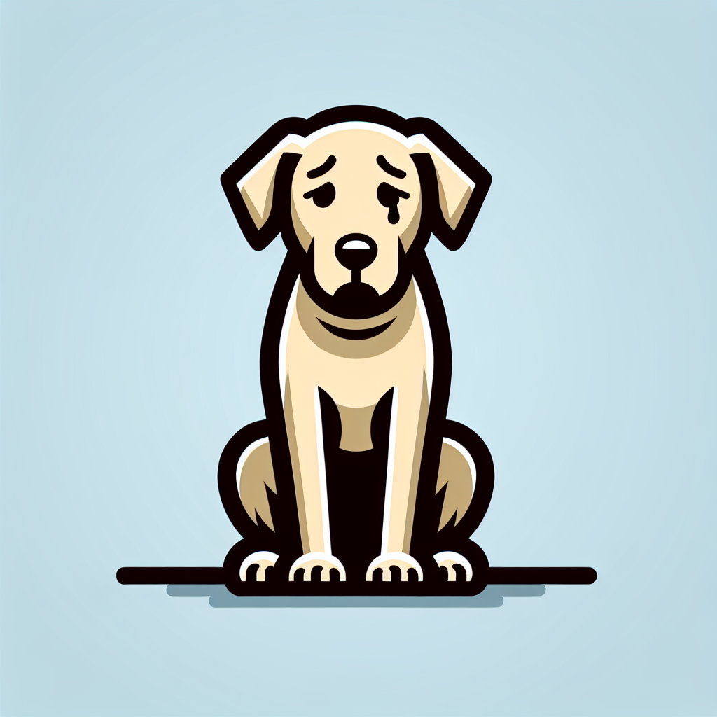 A cartoon drawing of a yellow Labrador Retriever with a sad expression and a single tear running down its cheek sits on a light blue background.
