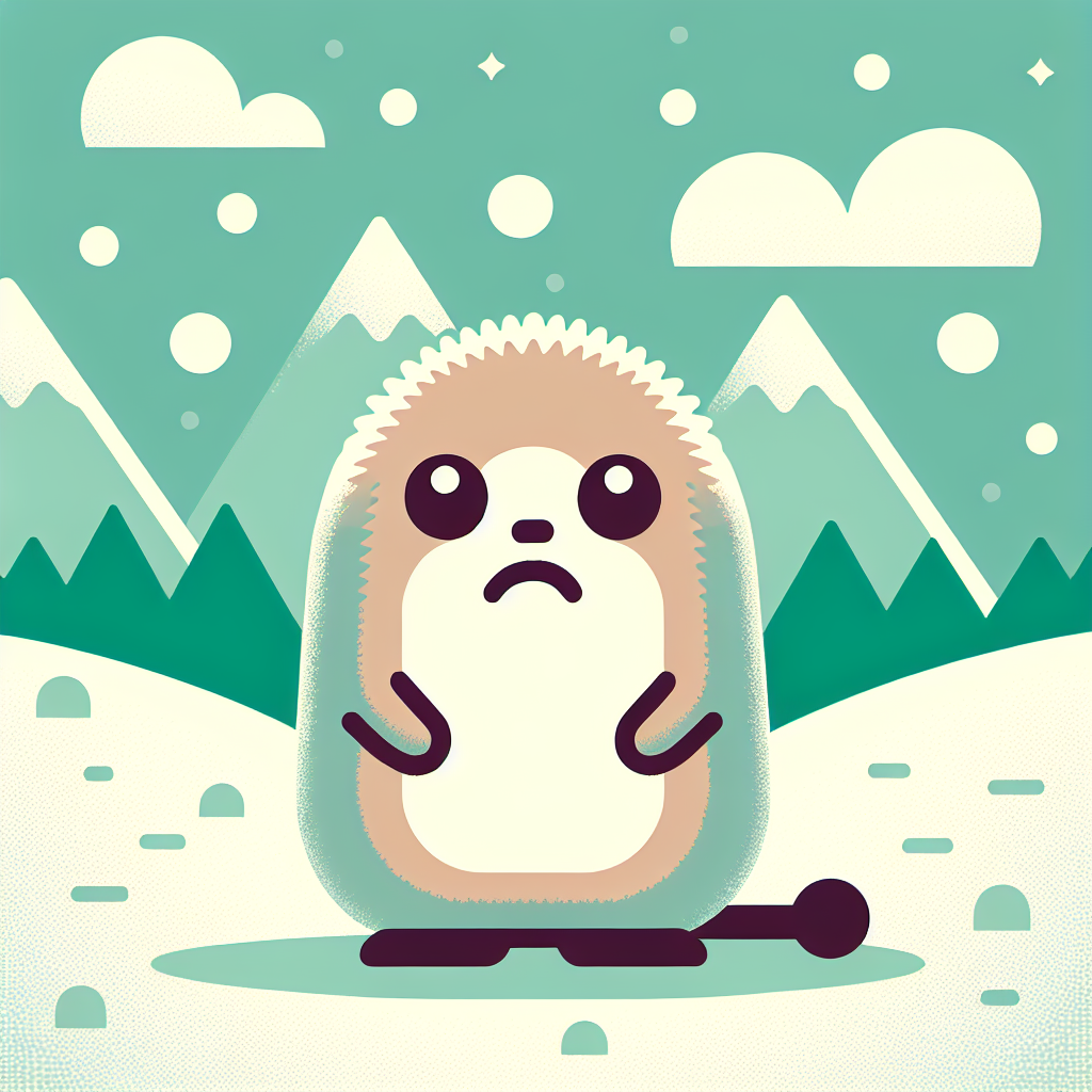 A small, round creature with a fluffy coat stands in a snowy landscape. Behind it are mountains and a clear blue sky.