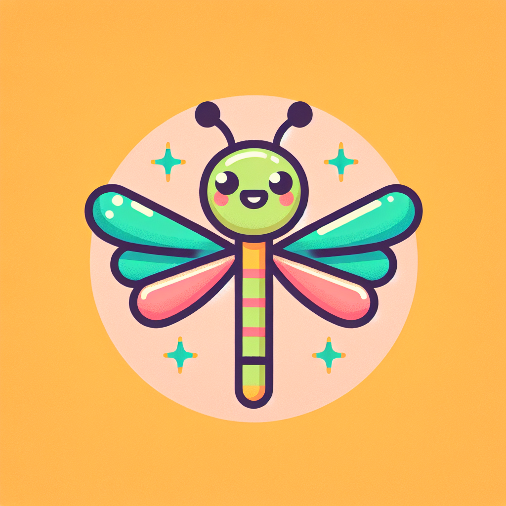 A cartoon dragonfly with large, colorful wings is depicted in a circle against an orange background