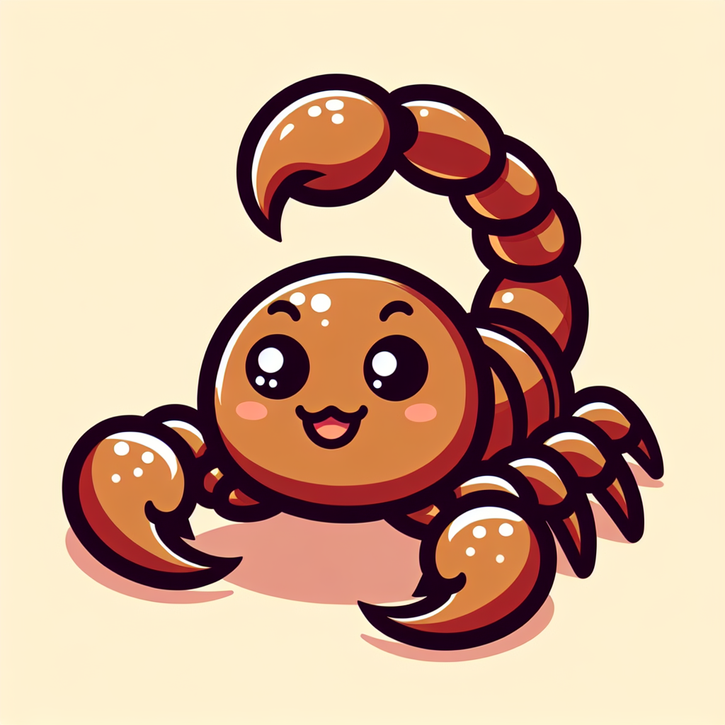 A cartoon illustration of a brown scorpion with large eyes and a wide smile. Its tail is curled up over its back.