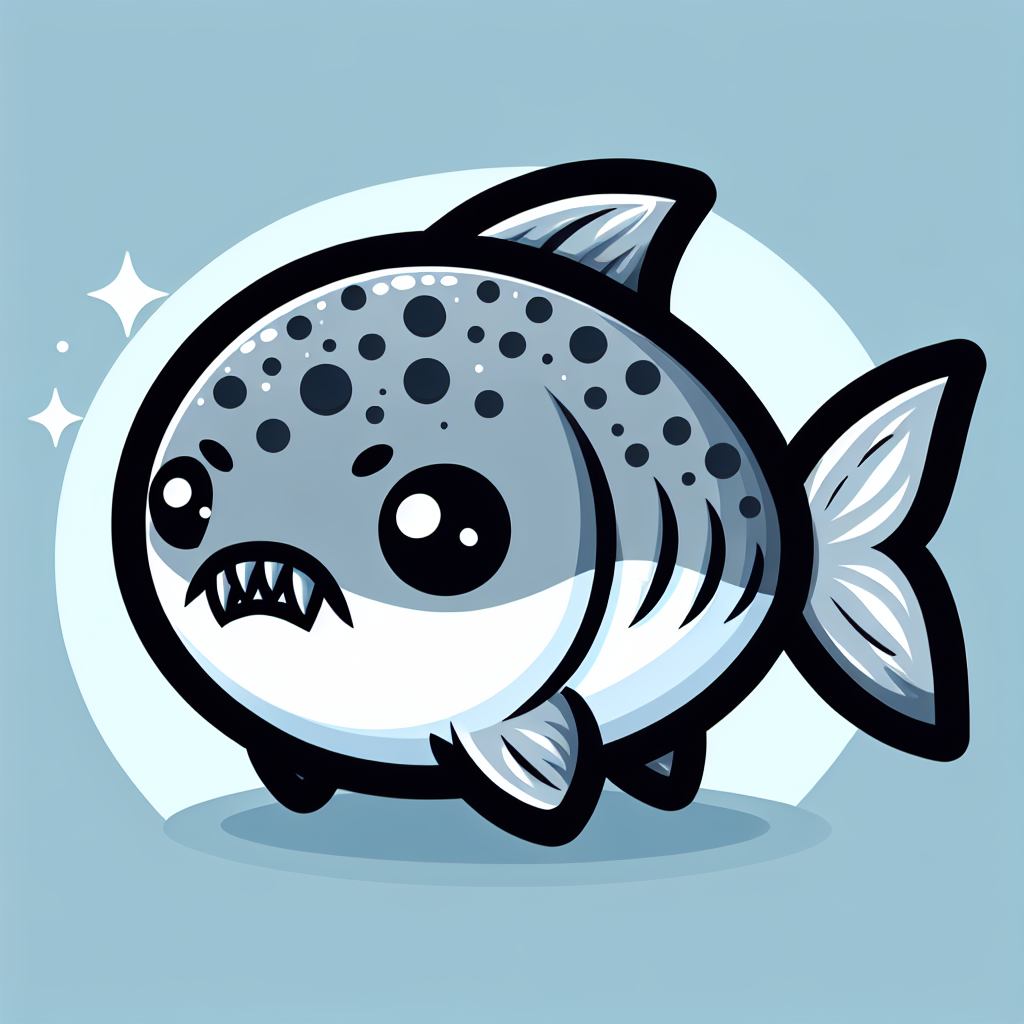A cartoon piranha with large, round eyes, sharp teeth, and spotted grey scales.