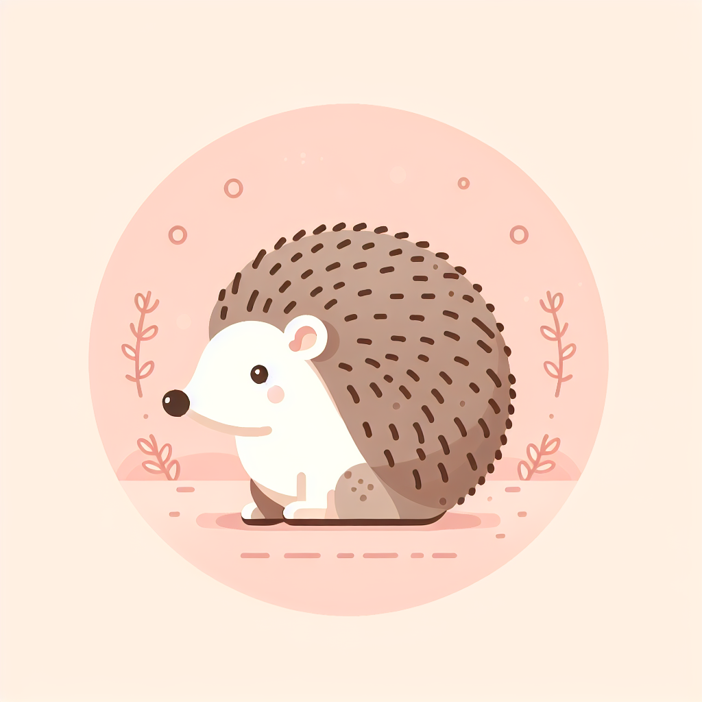 A cartoon hedgehog with a white belly and brown spines sits on a pink ground with pink floral details
