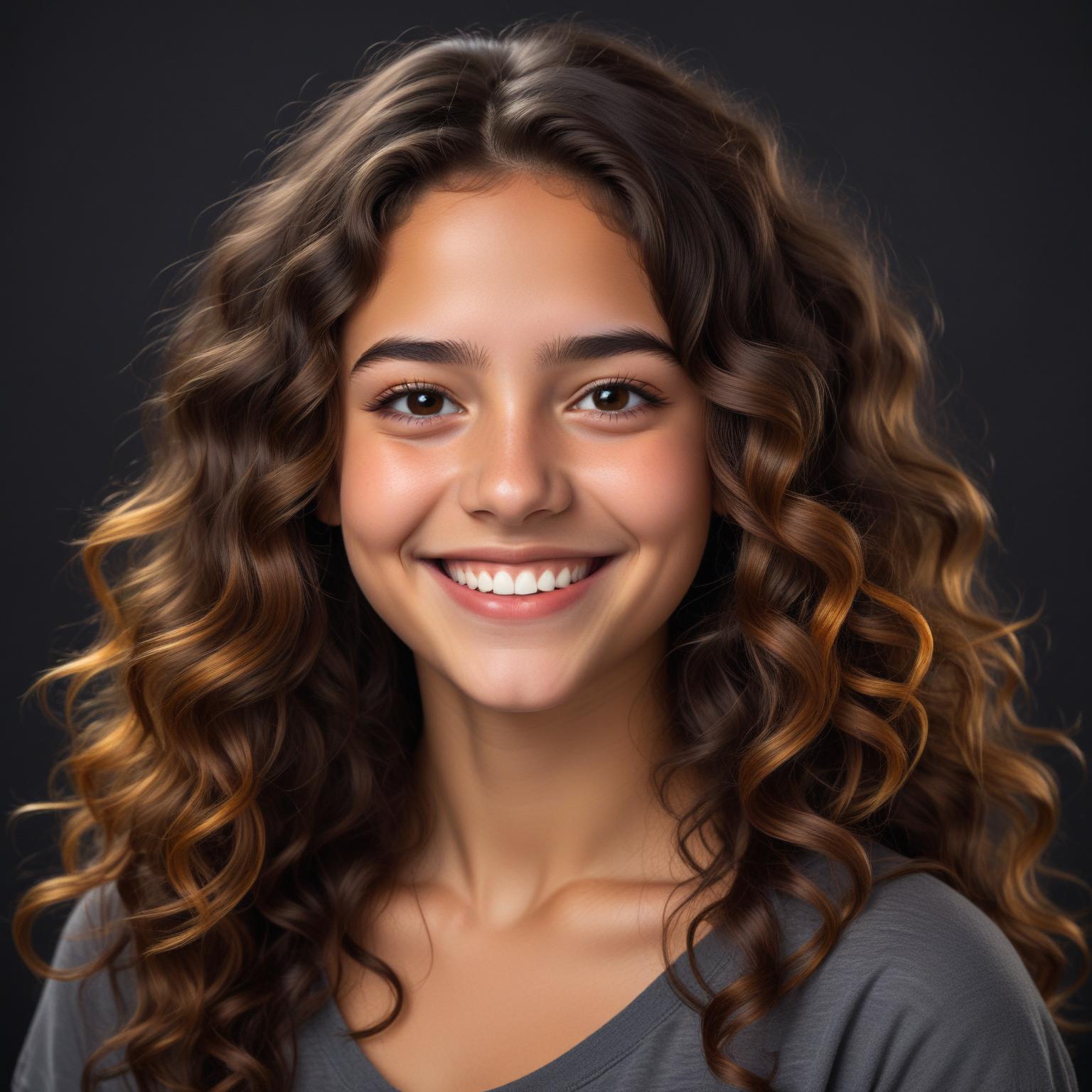 A young woman with long, brown, curly hair is smiling at the camera. She is wearing a gray shirt and has a natural makeup look