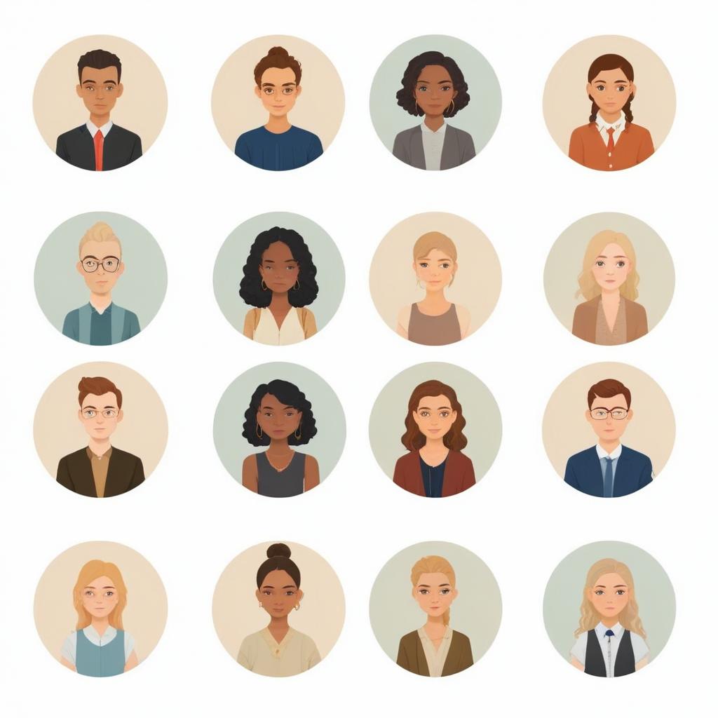 A collection of 16 cartoon profile pictures, featuring a variety of hairstyles, skin tones, clothing, and facial expressions.