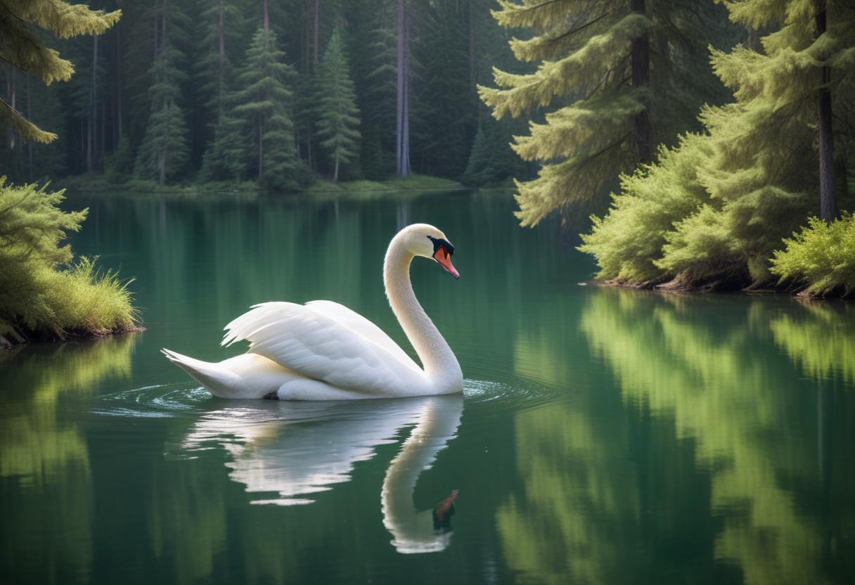 animal, bird, calm, forest, green, lake, landscape, nature, peaceful, quiet, reflection, serene, still, sunlight, swan, tranquil, trees, water, white, wildlife