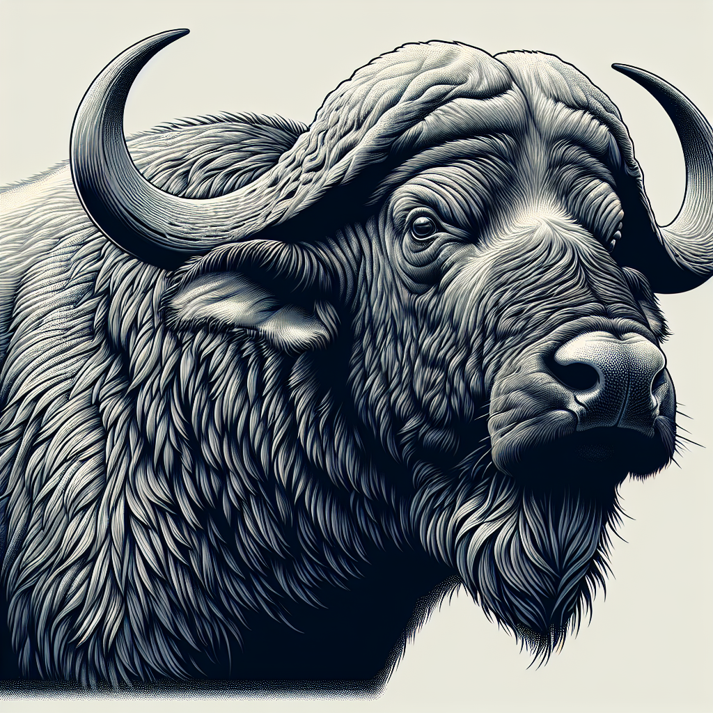 A detailed illustration of a Cape buffalo, showing its thick fur and large horns.