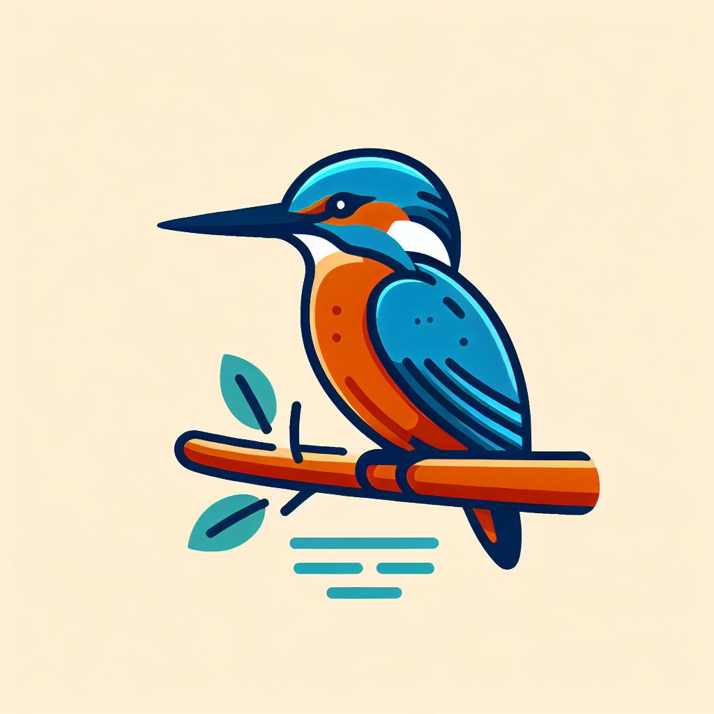 A cartoon kingfisher with blue and orange plumage perches on a branch with green leaves. Three blue lines are below the branch, suggesting water.