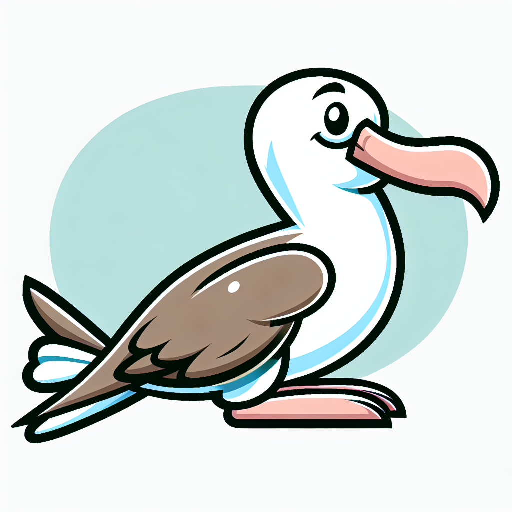 A cartoon albatross with brown and white feathers stands on a light blue circle. It has a pink beak, white chest, and light blue accents on its body.