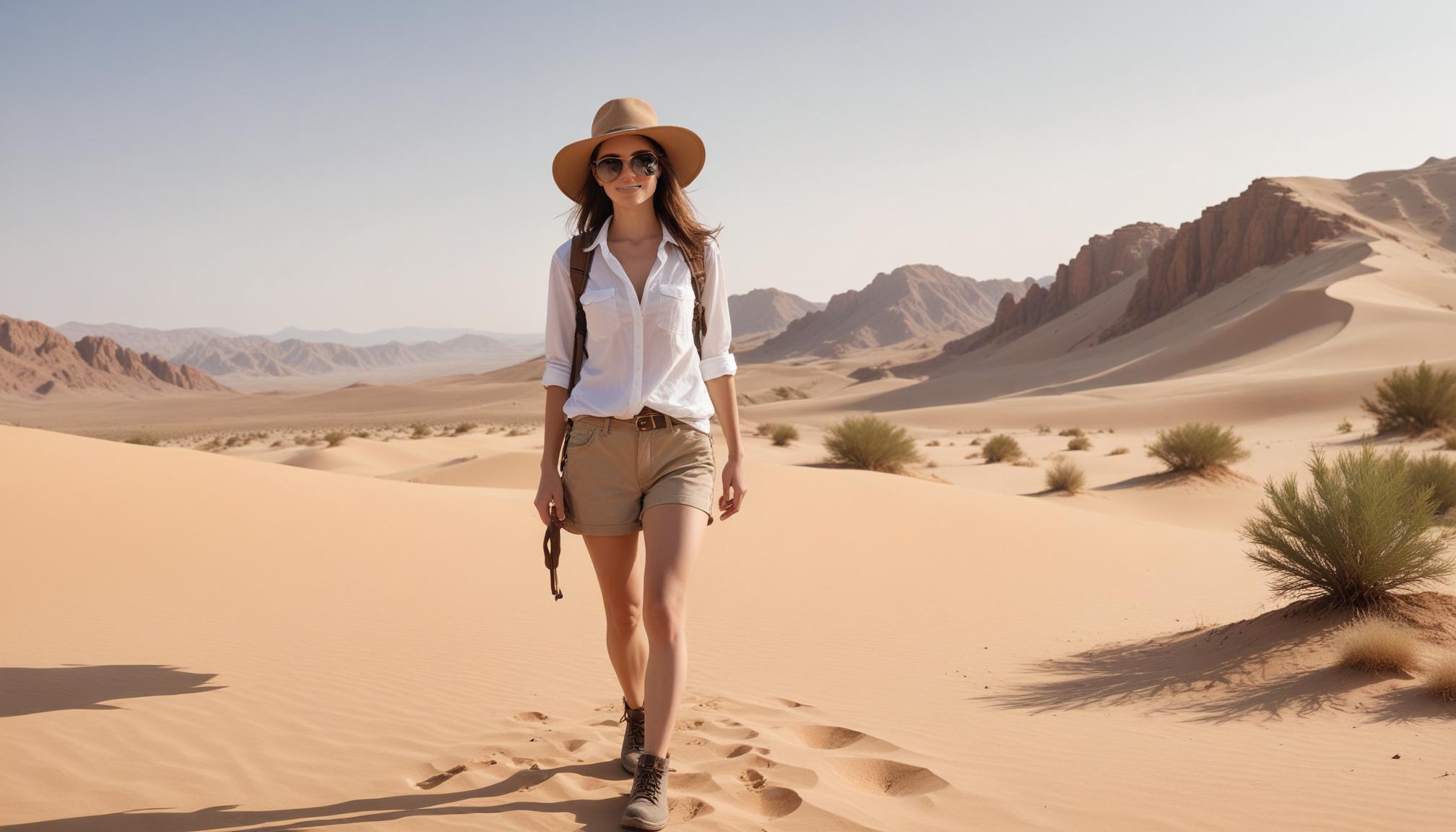 A woman wearing a hat, sunglasses, and a white shirt walks in a sandy desert