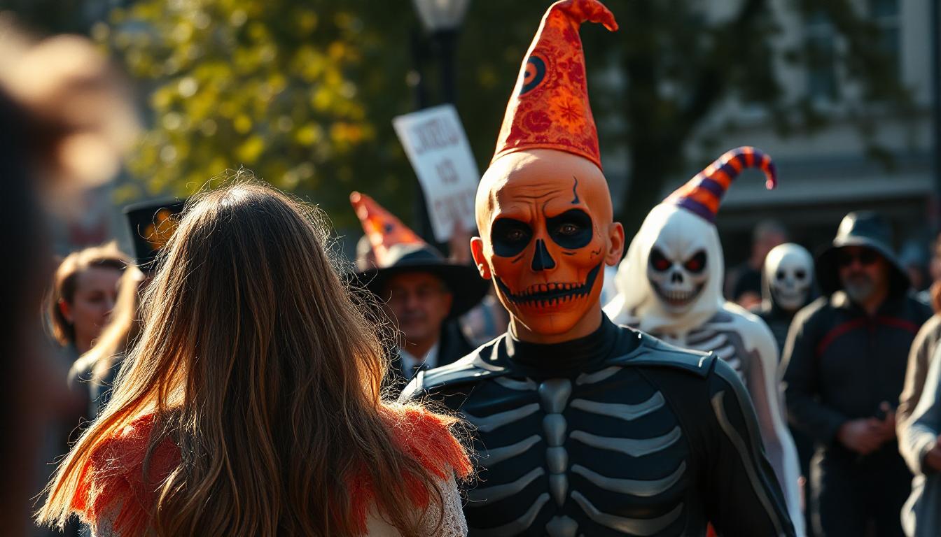 A man wearing a pumpkin mask and skeleton costume walks past a woman in a crowd of people. Other people in the crowd are wearing costumes.