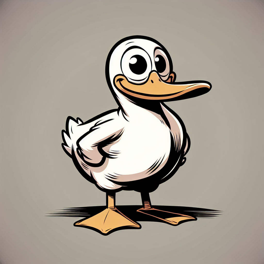 A cartoon duck with white feathers and orange feet and beak is standing on a light gray background. It has large, round eyes and a wide, open smile.