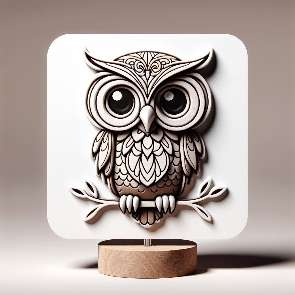A white square with a raised, detailed image of an owl perched on a branch. The owl is outlined in black with white and brown shading