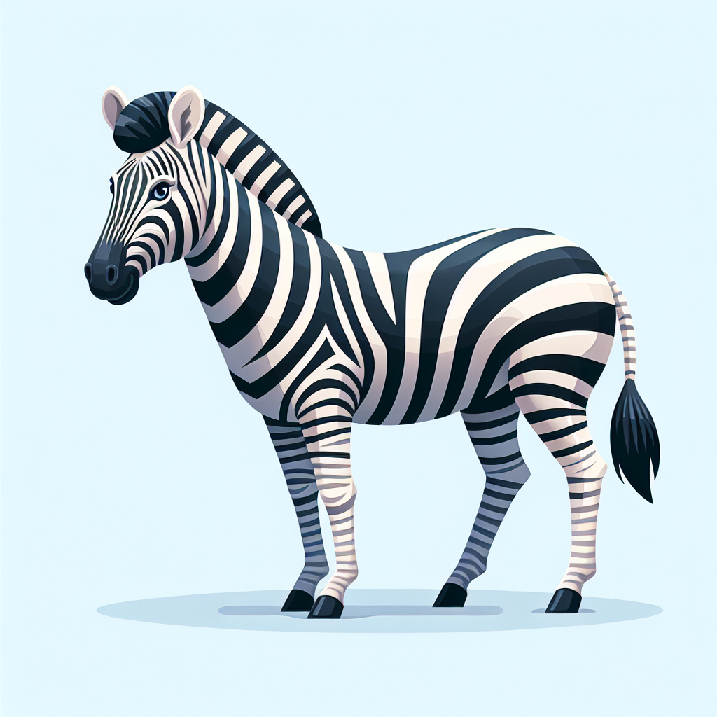 A black and white zebra with a distinctive mane stands on a light blue background.