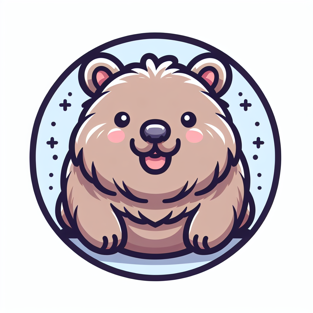 A cartoon wombat with brown fur, a pink nose, and a big smile sits in a light blue circle with white dots and plus signs.