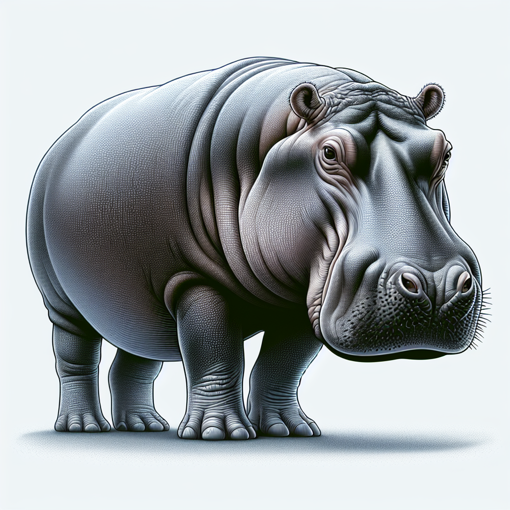 A large hippopotamus is depicted standing on a plain, white background