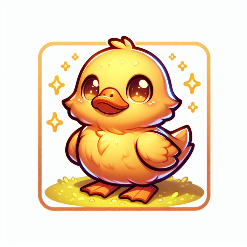 A cartoon duckling with large eyes is depicted standing on a patch of green grass. The duckling has a yellow body and orange feet