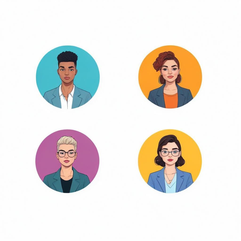 Four individuals with different hairstyles and skin tones are depicted in circular frames against a white background