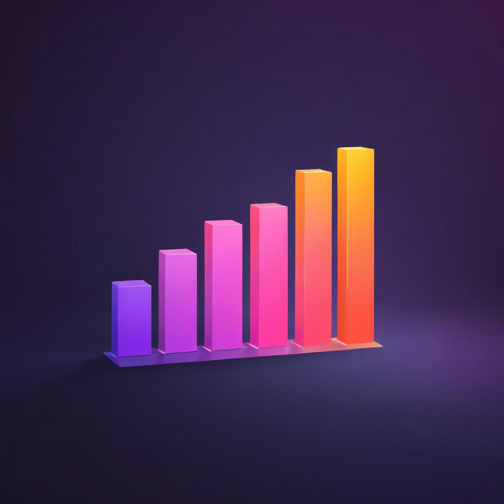A bar chart is depicted with seven bars, each taller than the one before, and increasing in color from purple to orange.