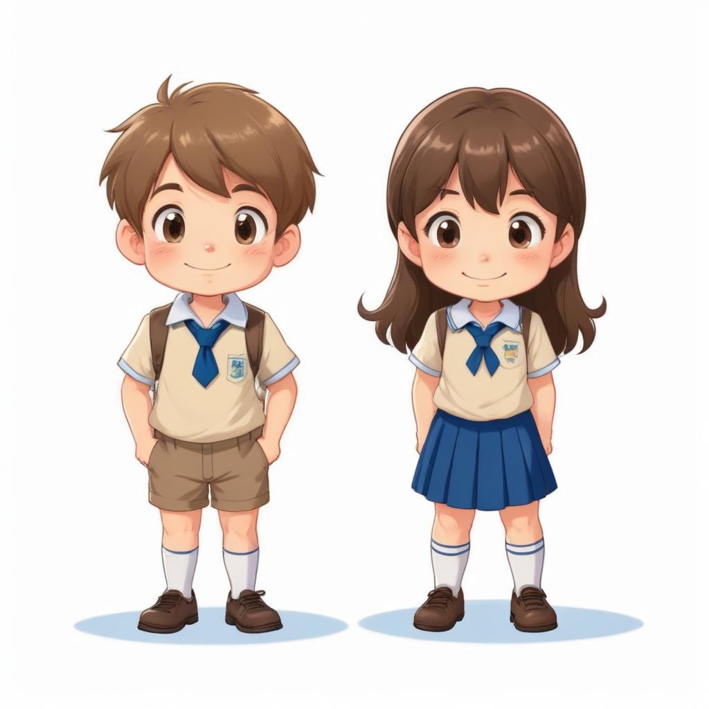 A young boy and girl stand side by side. They are wearing matching school uniforms, with tan shirts, blue ties, and khaki shorts or a blue skirt.