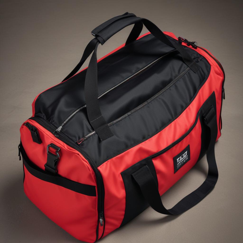 A red and black duffel bag is lying on a gray surface. The bag is unzipped and has a black handle.
