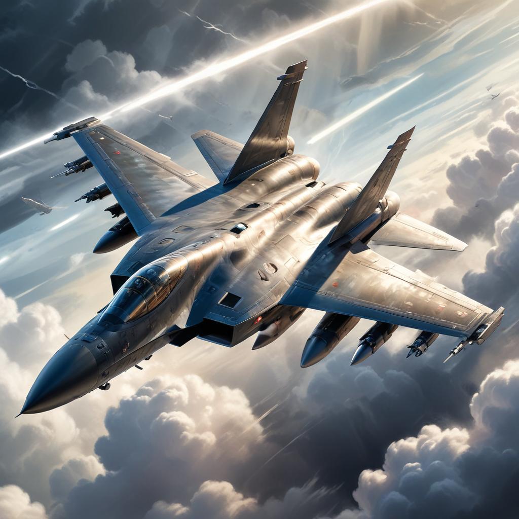 A silver fighter jet with missiles attached is flying high in the sky. The jet is surrounded by puffy white clouds.