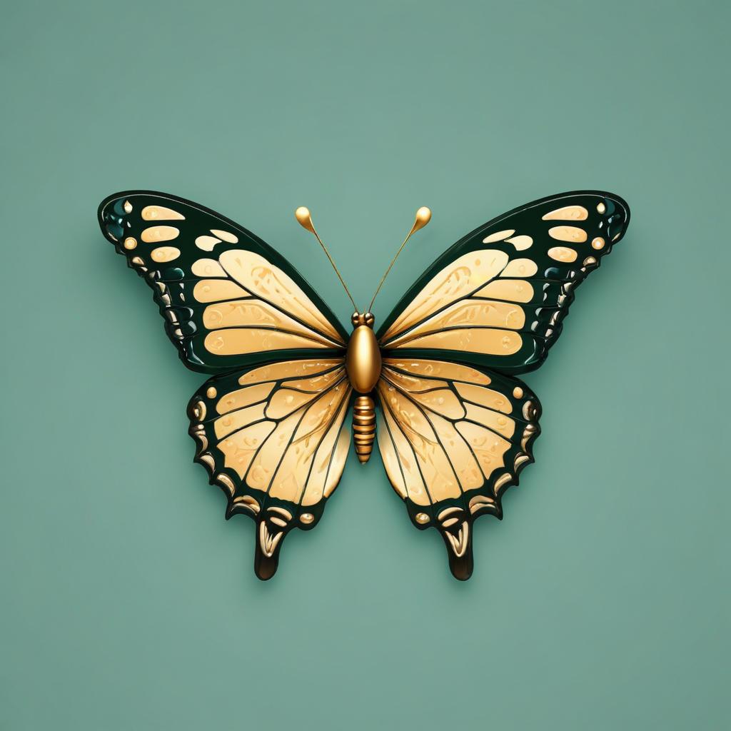 A stylized butterfly with golden wings and black borders is shown against a plain teal background.