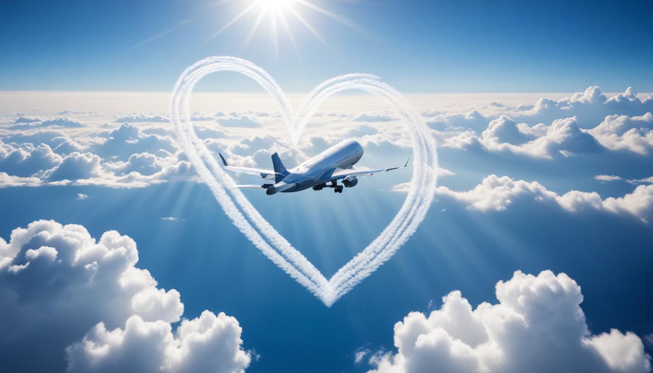 air, aircraft, airplane, aviation, blue, clouds, commercial, day, flight, fly, heart, jet, love, passenger, romantic, sky, sunny, trail, travel, white