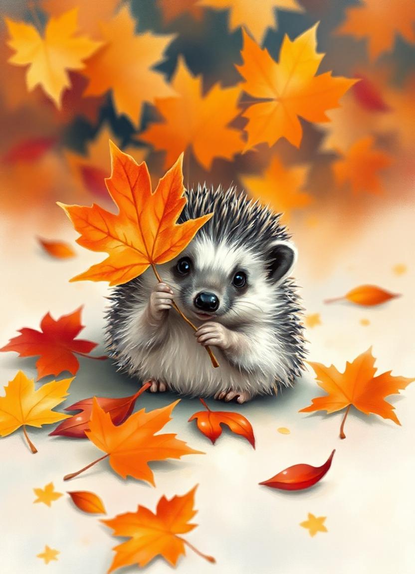 A small hedgehog sits amongst fallen orange leaves. The hedgehog is holding a large maple leaf in its front paws.