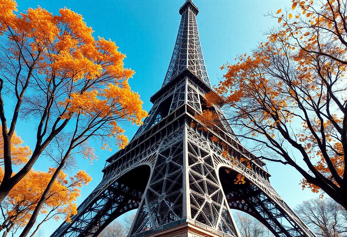 A low-angle view of the Eiffel Tower in Paris, with trees with fall foliage in the foreground. The sky is blue and clear.