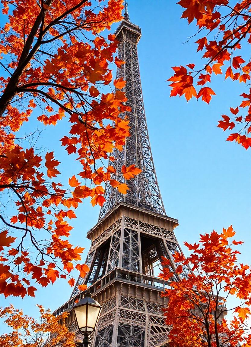 The Eiffel Tower stands tall, framed by vibrant orange leaves against a clear blue sky