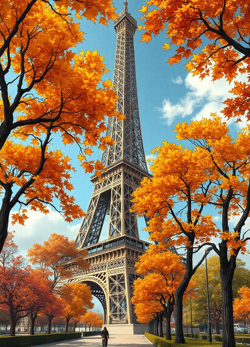 architecture, autumn, cityscape, clouds, eiffel, fall, foliage, france, landmark, leaves, metal, orange, paris, sky, structure, tower, travel, trees, vacation, yellow