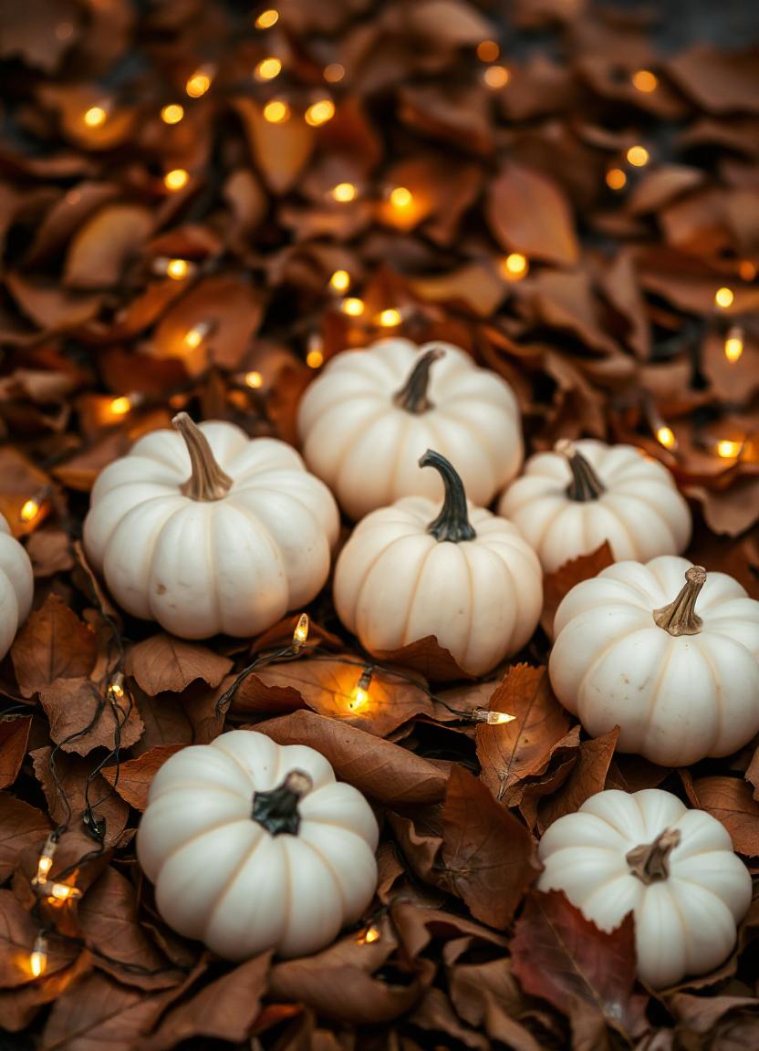 White pumpkins are arranged among brown autumn leaves and strung lights.