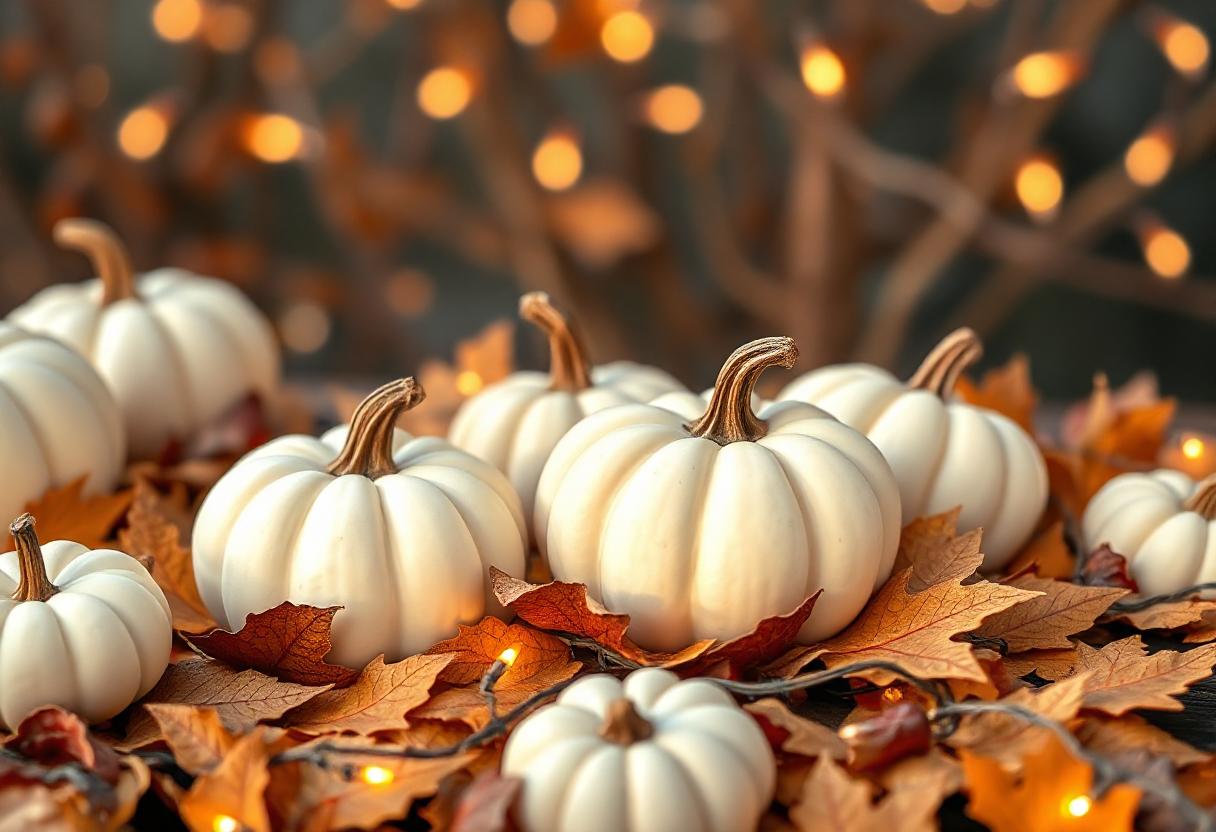 White pumpkins on fall leaves with lights