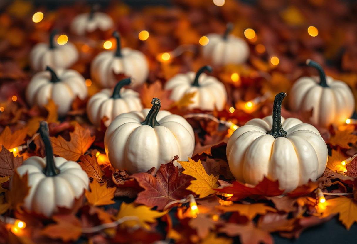 A group of white pumpkins are arranged in a bed of autumn leaves, with string lights illuminating the scene.