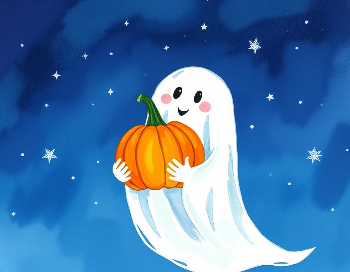 A cartoon ghost with a smiling face is holding a large orange pumpkin with both hands. It is floating against a dark blue sky with white stars.