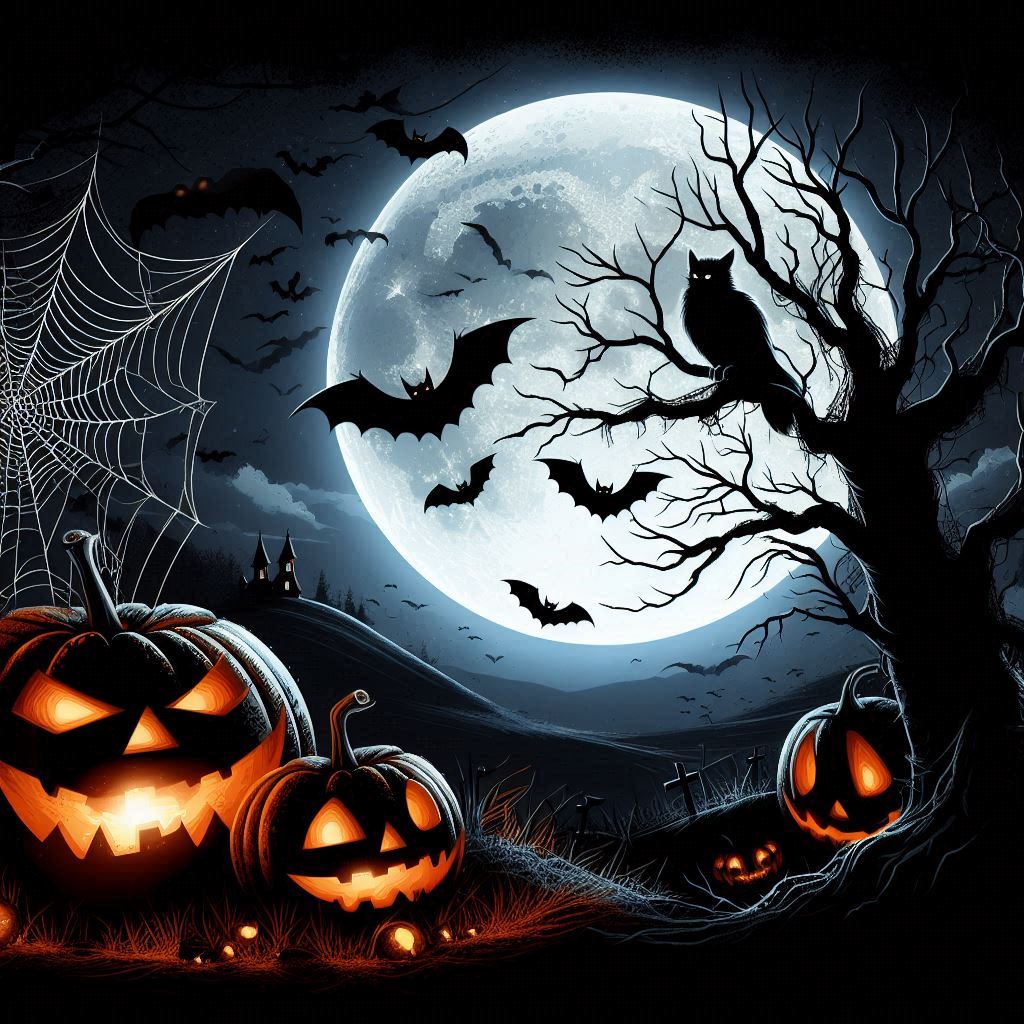 Jack-o'-lanterns sit in a grassy field with a full moon and a black cat in a tree behind them. Bats fly through the air.
