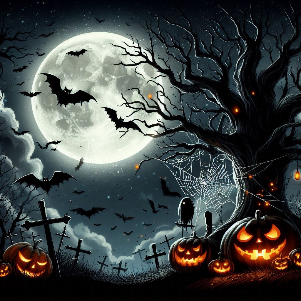 A full moon shines brightly in the night sky over a graveyard. A large, bare tree with a spiderweb hangs above the carved pumpkins