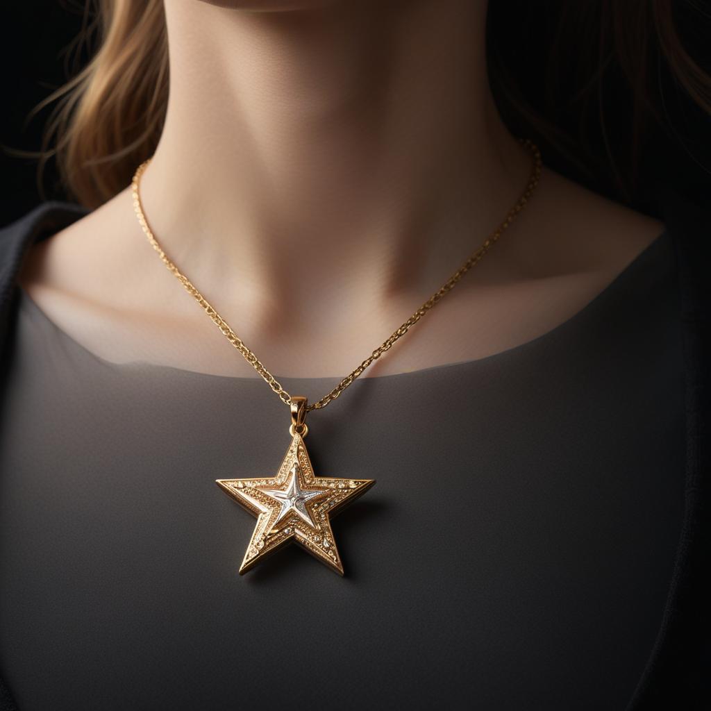 A woman is wearing a gold chain necklace with a large star pendant.