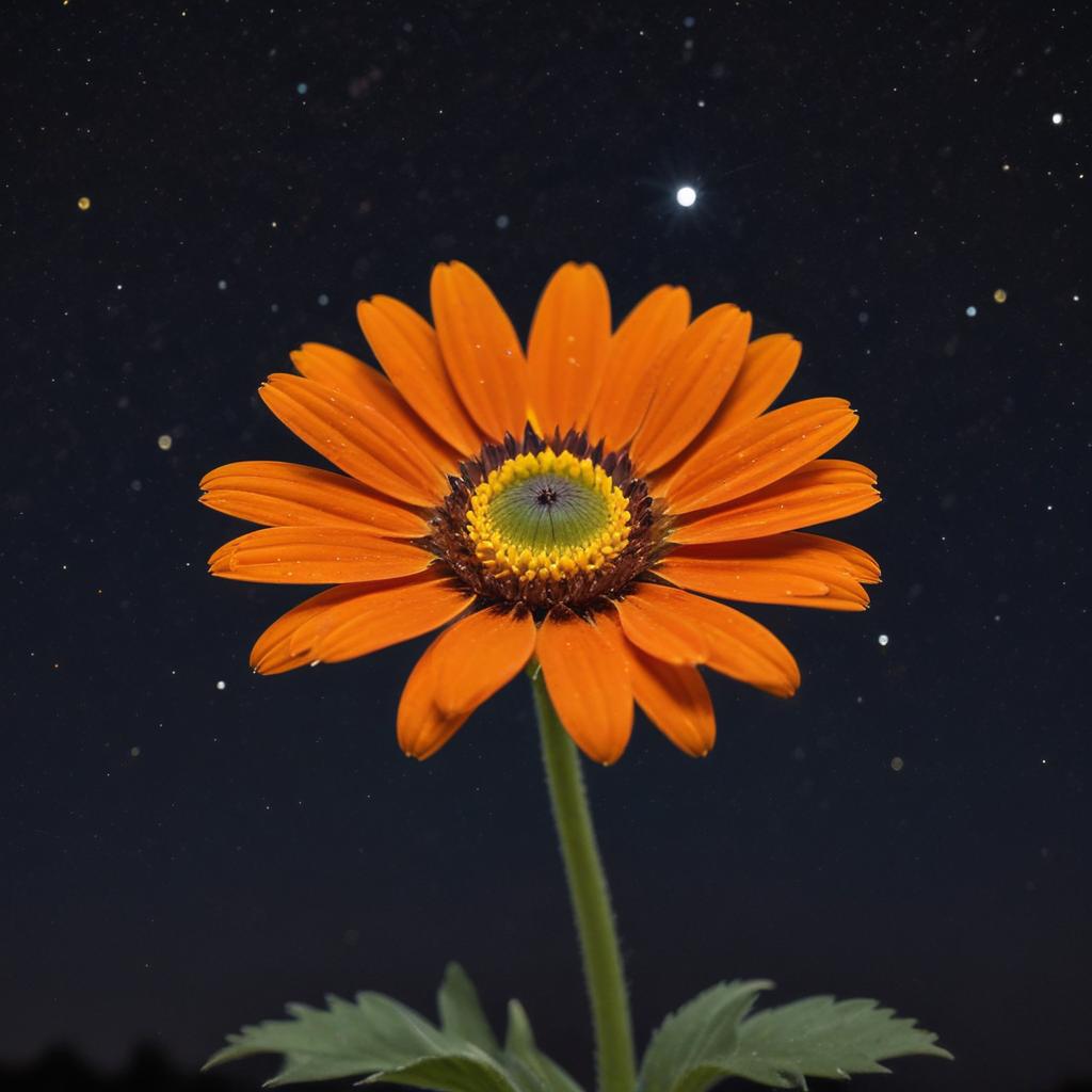 A single orange flower blooms under a starry night sky