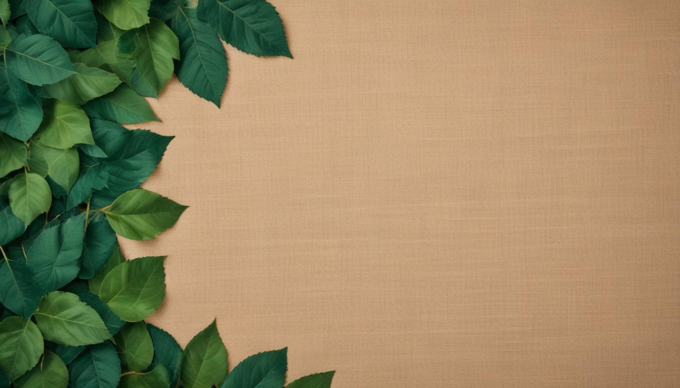 Green leaves border a tan background