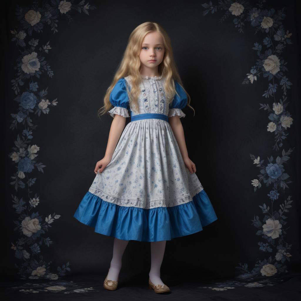 A young girl with long blonde hair wears a white and blue dress and stands in front of a dark background with floral designs on either side.