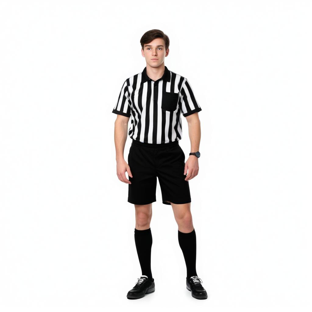 athlete, athletic, background, black, competition, game, male, man, official, officiating, referee, rules, shorts, socks, sport, sports, standing, stripes, uniform, white